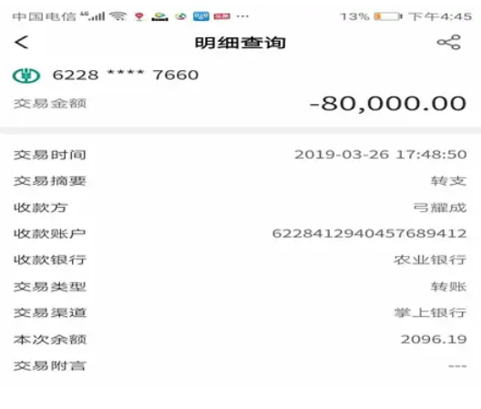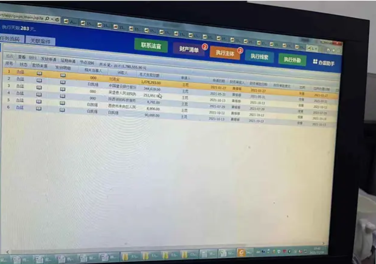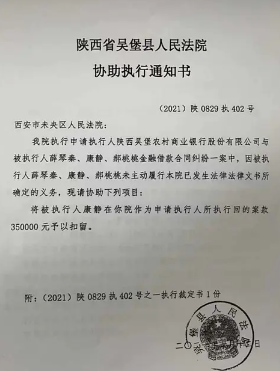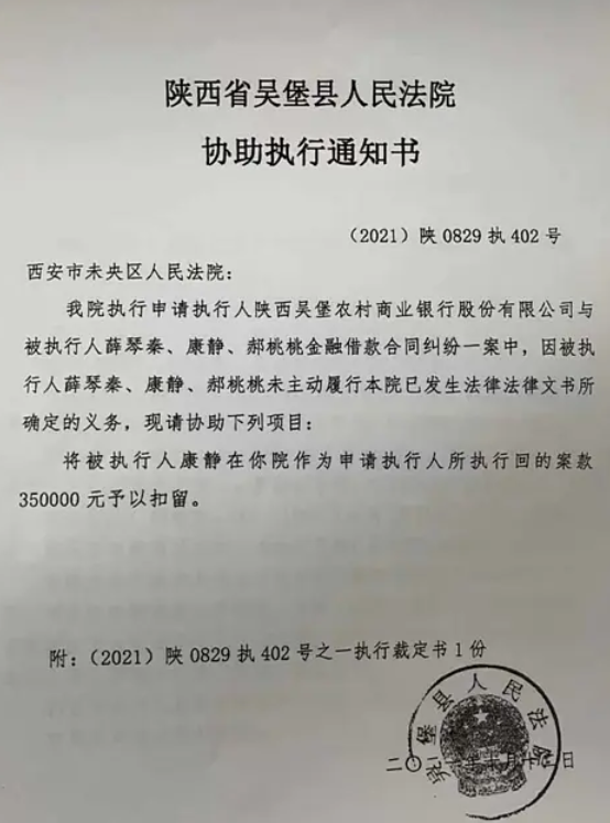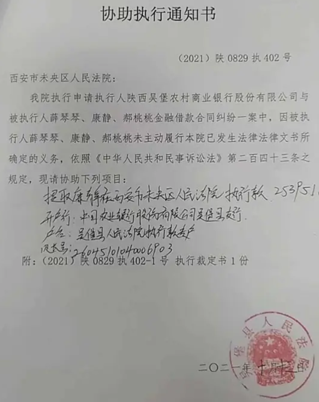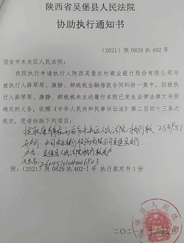 2021年8月宋家川支行将贷款人及保人一并起诉到吴堡人民法院,案子还在审理当中,10月12日法院出具了协助执行书,案号(2021)陕0829执402号,扣留康女士款项35万元,10月13日将康女士25395.1元划扣走,薛琴琴儿子当天划走9万元。(图片法院系统转出凭证)。