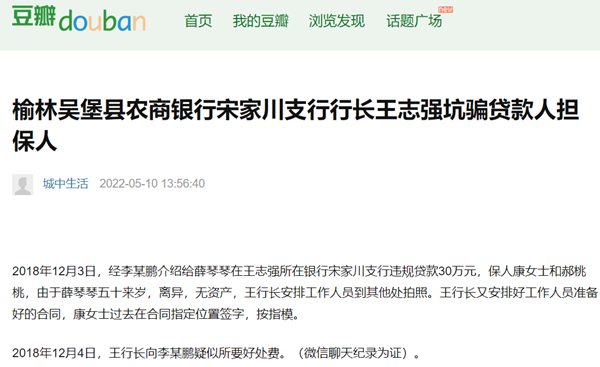 2018年12月3日,经李某鹏介绍给薛琴琴在王志强所在银行宋家川支行违规贷款30万元,保人康女士和郝桃桃,由于薛琴琴五十来岁,离异,无资产,王行长安排工作人员到其他处拍照。王行长又安排好工作人员准备好的合同,康女士过去在合同指定位置签字,按指模。