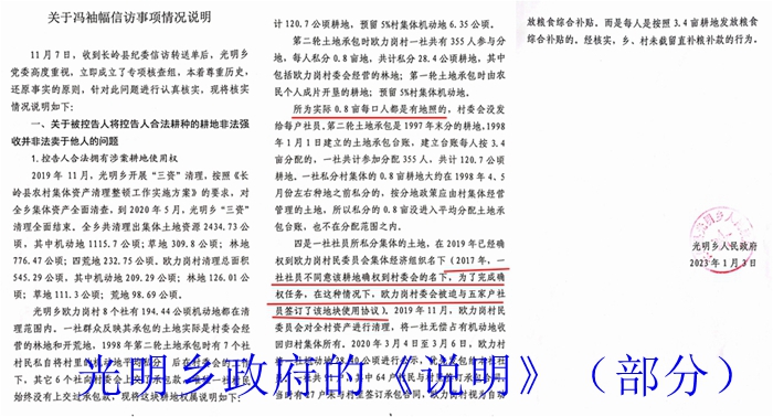 对于村民们反映的问题,光明乡政府2023年1月3日做出了《关于冯袖幅信访事项情况说明》(以下简称《说明》)做出了说明或称解释。该《说明》首先称一社每户的0.8亩土地是村民私分的,没有经过村委会同意,“群众反映的土地不在村民承包分配面积范围之内,该地块不能作为平均承包地承包。所以,该地块使用所有权归欧力岗村委会所有。”“一社群众私分的耕地没通过欧力岗村民委员会同意,纳入平均发包范围之内,也没有经过当时一社二轮土地承包5人小组同意和参与共同分配的,是第二轮土地承包结束后,一社村民擅自将28.40公顷村集体管理的机动地每人按0.8亩(大亩)分给355人,属于私分集体土地,无偿占有村集体机动地,是违法行为。三是经查阅欧力岗村一社第二轮分地台账,每人分3.4亩耕地。一社社员私分的0.8亩不在台账范围内,进一步证明该地块属于欧力岗村集体机动地。”但《说明》随后又称:“实际0.8亩每口人都是有地照的,村委会没发给每户社员”,承认这些耕地“都是有地照的”,只是“村委会没发给每户社员”。