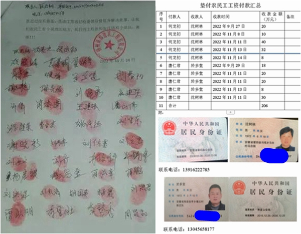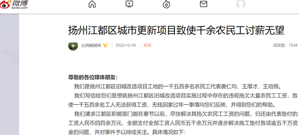 眼见2023年春节临近,手下一千多民工兄弟急等工钱回家过年。肖某、黄某、王某等人站出来与老顾、老何一起联名向媒体写了一封公开信《扬州市江都区城市更新项目致使千余农民工讨薪无望》,并于2022年12月16日开始陆续被多家网媒转发。网络发布第一天(2022年 12 月16 日)下午,老何就接到了江都区仙女镇上派出所某副所长电话,电话里声称“要抓人”,霸气的官威确实把老何等人吓了一跳。