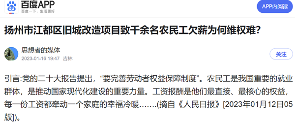 中央一再强调,“全社会都要关心关爱农民工,要坚决杜绝拖欠、克扣农民工工资现象,切实保障农民工合法权益"。在此,我们也呼吁江苏省扬州市江都区相关部门领导能够切实的履职、尽职,切莫“上令下不达”,让国家的规定成了一纸空文!