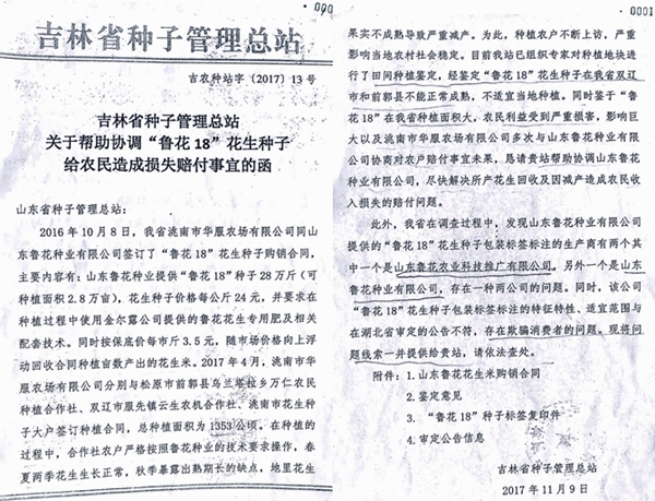 他们还举证称,鲁花公司涉嫌虚假宣传隐瞒生长期诱骗种植户。对此,吉林省种子管理总站吉农种站字[2017]13号《关于帮助协调“鲁花18花生种子给农民造成损失赔付事宜函》说的十分清楚:“我省在调查过程中,发现山东鲁花种业有限公司提供的‘鲁花18’花生种子包装标签注明的生产商有两个,其中一个是山东鲁花农业科技推广有限公司,另一个是山东鲁花种业有限公司,存在一种两公司的问题。同时,该公司‘鲁花18’花生种子包装标签标注的特征特性、适宜范围与在湖北省审定的公告不符,存在欺骗消费者的问题。”