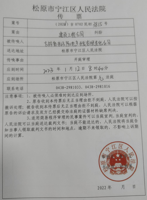 2023年1月7日,东环公司接到宁江区法院传票,通知其于2023年1月12日8点40分到宁江区法院开庭,代总和律师刚准备好与鉴定有关的资料,却接到了取消开庭的通知,通知取消开庭的法官自称姓焦,他表示原来的罗法官退休了,该案以后由他接任审理。