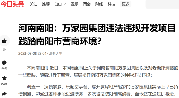 调查一:负债累累,玩起空手套。靠开发房地产起家的万家园集团实际上早已负债累累,却通过各种手段逃避债务,多次被法院限制高消费,至今还在通过讲概念、讲故事,忽悠开发新项目绑架政府。根据中国执行信息公开网查询显示,邢清鑫及其万家园集团早在2018年7月就被纳入失信被执行人名单,涉案几百起,被执行金额高达10亿元,多次被列入“黑名单”,28次被采取限制高消费等措施。