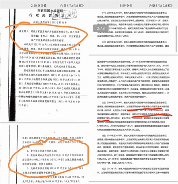 调查二:非法占用农用地,大肆行贿国家工作人员。据了解,万家园公司及邢清鑫通过各种方式行贿政府公务人员,为其谋取非法利益保驾护航。万家园集团及邢清鑫深耕南阳三十余年,特别是在房地产开发过程中,其在卧龙风景区旁边开发了莲花湖养生城项目,但该项目在未取得土地、规划、建设等相关手续的情况下,以养老项目为名,开发建设别墅及高层楼房等对外出售,涉嫌严重违法用地。南召县国土部门早在2015年就对该项目非法占用农用地进行了行政处罚,认定河南万家园房地产开发集团有限公司开发的莲花养生城项目的违法用地属于严重违法,责令退还非法占用的土地,限十五日内自行拆除在非法占用土地上的建筑物和其他设施,恢复土地原状,并处以罚款。期间,也有部分媒体进行公开报道,但截止目前,非法用地上的建筑物依旧,是否存在地方保护不得而知。为了保障开发项目的巨大利益以及为违法违规建设保驾护航,万家园集团及邢某行贿多名官员,其中就包括时任南召县委书记鄢国宾。2016年,鄢国宾因涉嫌受贿被调查,2017年12月河南省平顶山市湛河区法院作出判决,判决书中载明,邢清鑫分别给予其人民币6万元、美元2万元、代为支付保姆工资6.2万元以及一套价值57万元的房产(详见鄢国宾受贿一审刑事判决书,[2017]豫0411刑初156号)。