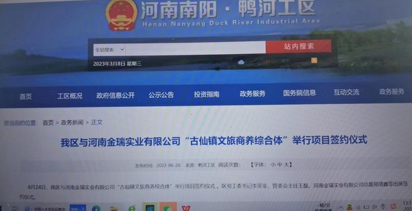 本网记者通过查询得知,南阳市鸭河工区网站显示, 2022 年 6 月 24 日,鸭河工区与河南金瑞实业有限公司“古仙镇文旅商养综合体”举行项目签约仪式,河南金瑞实业有限公司总裁邢清鑫等出席签约仪式,并表示该项目计划总投资120亿,建设用地约 5000 亩。据企查查显示,河南金瑞实业有限公司 2022 年 6 月 14 日注册成立,注册地址为南阳市鸭河工区皇路店镇高咀坡村赵家庄 6 号成园农业办公楼,这个地址就是邢清鑫的私人庄园。