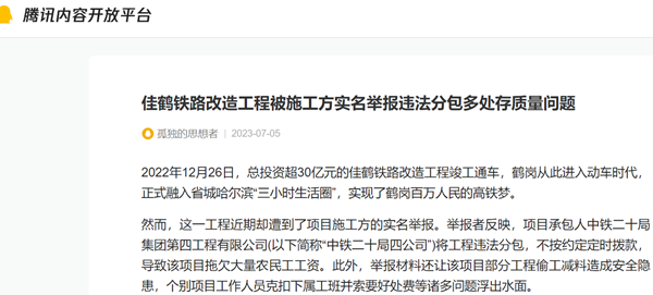 此外,杨永余等人还反映了李学平等项目工作人员克扣下属工班并索要好处费等诸多问题。记者了解到,此前,杨永余等人已将举报材料递交给中铁二十局集团及佳木斯市铁路指挥部。但目前还没有收到反馈信息。