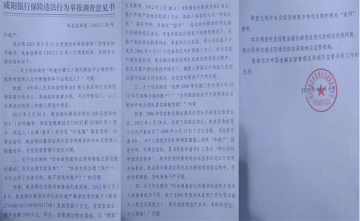中国金融监督管理总局咸阳监管分局受理我们父子举报事项后,经过调查于近日答复称,涉事银行在办理该笔贷款过程中,存在贷前调查、贷时审查不严以及贷款管理不到位的问题,表示将依据实际情况依法采取相应监管措施,但并未实际解决我父亲许超产的银行欠款问题。
