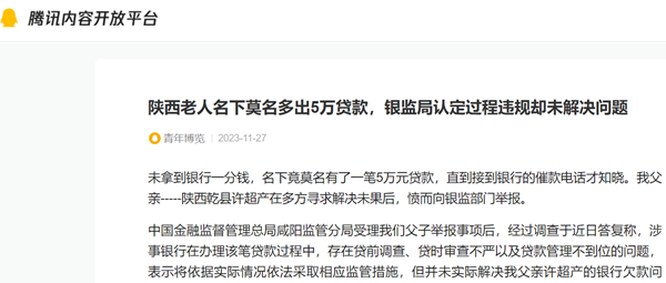 未拿到银行一分钱,名下竟莫名有了一笔5万元贷款,直到接到银行的催款电话才知晓。我父亲-----陕西乾县许超产在多方寻求解决未果后,愤而向银监部门举报。