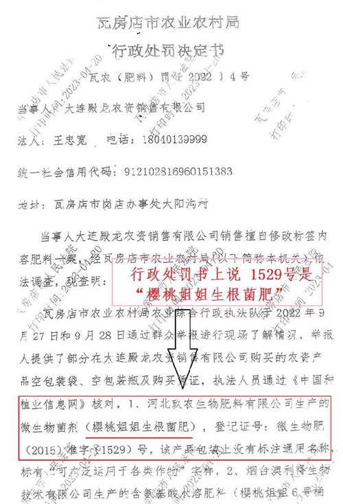 ——瓦房店市农业农村局对2种肥料做出的行政处罚决定书,其中涉及的微生物肥(2015)准字(1529)是“樱哥大樱桃专用生根菌肥”,而不是处罚决定书中所说的“樱桃姐姐生根菌肥”,“樱桃姐姐生根菌肥”的登记证号是微生物肥(2018)准字(5451)。你们连处罚了哪种产品都会写错,如此破绽百出的行政处罚决定书,工作专班都没有发现?这叫“认真核查”“事实清楚”吗?你们就是以这个错误的处罚决定书回复大连市委、市政府和省委、省政府的吗?