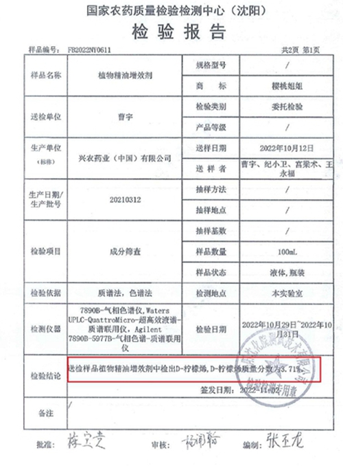 6、农户自行送检的“樱桃姐姐9号-植物精油增效剂”,在其中检出生物农药成分D-柠檬烯,但是该产品无农药登记证号,应判定为假农药,为何不查处?农户于可伟送检的“纯天然植物橙皮精油”,检出高含量的隐性添加成分烷基葡萄糖苷等,也属于假农药,为何不查处?还有多款肥料均被检测不合格,为何不查处?