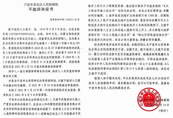 王吉义不服,向宁波市检察院进行申诉。宁波市检察院随后做出的刑事申诉结果通知书(甬检刑申通[2022]14号)维持了奉化区检察院的不起诉决定。然而,令人感到不解的是,检方查明的事实与警方的侦查基本一致,但该通知书却称:“关于申诉人提出的申诉理由,本院认为,根据现有证据,已查明2011年9月,王建平及其所实际控制的凯创公司在陷入严重资金困难的情况下,仍招徕王吉义等投资人参与开发二道柳煤炭资源灭火工程、海伊奎煤矿灭火工程,其中申诉人王吉义先后投资6600万元、1710万元。在项目未如期开工时,王吉义等投资人将对王建平的债权直接转为股权,组建鄂尔多斯市中金投资有限公司直接参与直升机项目开发,截至目前,该项目实际未能落地。”但是,检方依然认为:“本案大量关键性事实尚未查明,主要定罪证据未能调取,如本案直升机项目未能获取配置煤炭资源的原因,王建平是否在明知直升机项目无法配置煤炭资源的情况下,通过虚构事实、隐瞒真相的方式,诱骗王吉义等人参与投资,王建平是否通过虛构事实、隐瞒真相的方式,使王吉义等人陷入认识错误,组建中金公司,后逐渐退出中金公司持股等。”