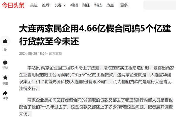 本站讯 两家企业因工程款纠纷上了法庭,法院在核实工程总造价时,暴露出两家企业曾用假的施工合同骗取了银行5个亿的工程贷款。这两家企业就是“大连宜华建设集团”和“北首光源科技(大连)股份有限公司”,而为他们贷款的是建行大连青泥洼桥支行。