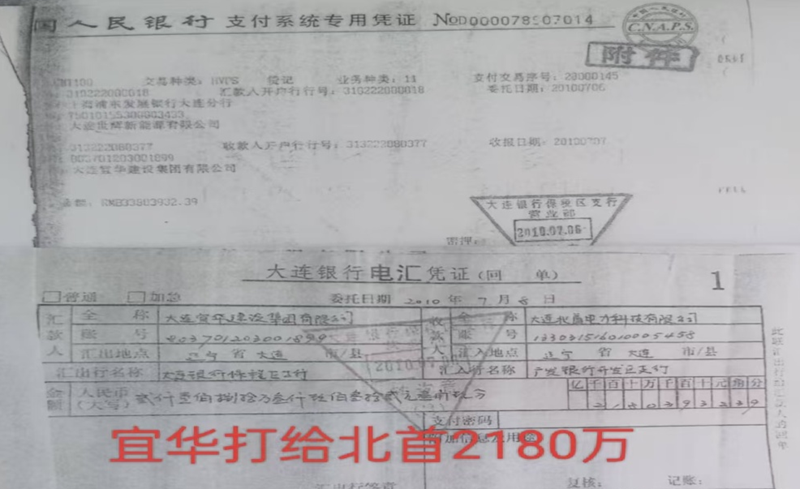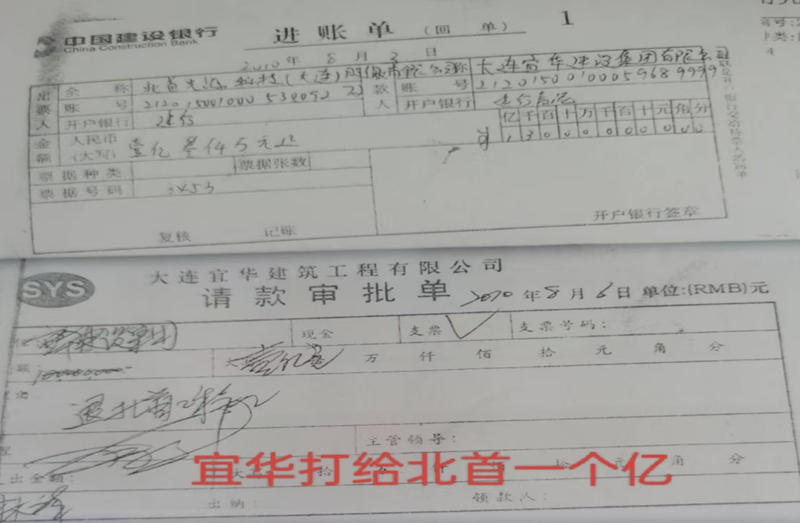 两家企业在打工程款官司时,北首光源科技为法院提供了每次给大连宜华打款的帐目凭证,法院也核查出,该工程总造价为3.22亿元。截止到2014年6月6日,北首光源科技共打给大连宜华工程款为3.64亿元,但是,这些款项并没有全用在该工程上,大连宜华的帐目显示,在2010年7月6日,大连宜华将收到的工程款2180万元,打给了与此工程无关的北首科技下属的另一家公司。2010年8月3日,大连宜华又将1亿元贷款直接转给了北首光源科技,最终这个项目实得工程款仅为2.43个亿,可银行确确实实贷出了5个亿,还有近1.4个亿下落不明。