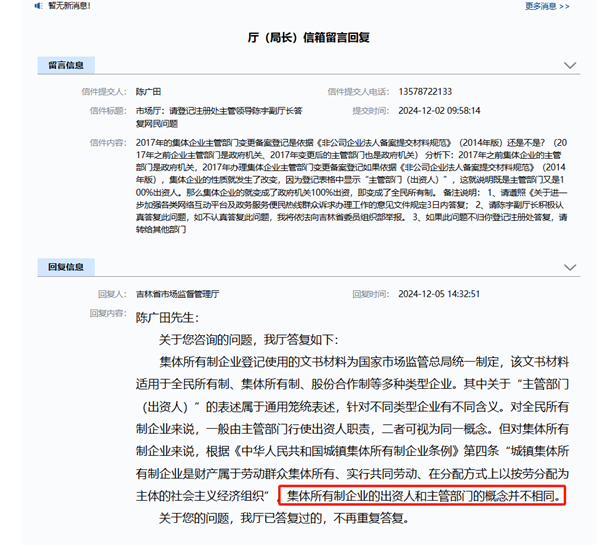(6)2024年12月5日,厅长信箱答复:集体企业登记文书材料中关于:“集体所有制企业的出资人和主管部门并不相同”。但是宽城区法院行政裁定书(2018)吉0103行初51号中却认为主管部门和出资人等同即主管部门和出资人概念相同。省市场监管厅的说法和审批办做出的具体行政行为结果明显不一致且造成严重后果,应该予以及时纠正。