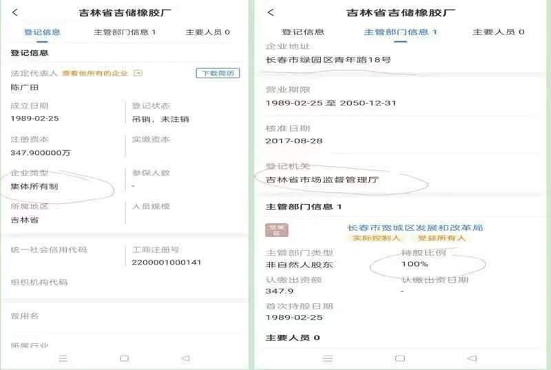 (7)吉林省吉储橡胶厂现在属于登记机关在省市场监督管理厅,企业住所在绿园区,主管部门在宽城区,所有制形式为集体企业,政府机关100%出资,2005年营业执照吊销,2017年8月营业执照“起死回生”,企业职工如孤魂野鬼无家可归的“怪胎企业”,不伦不类。