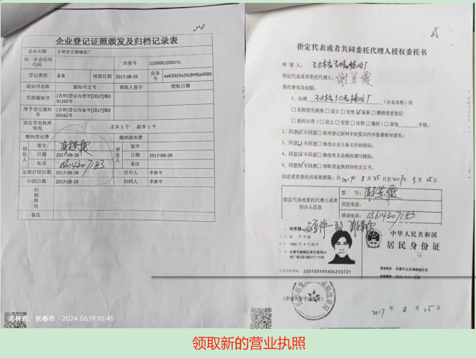 (5)早在2005年,吉储橡胶厂营业执照就已经吊销,省市场监管厅2017年8月27日再次颁发并由宽城区发改局授权的指定代理人谢景霞领取新的吉林省吉储橡胶厂营业执照,这严重违反了《中华人民共和国企业登记管理条例》规定。