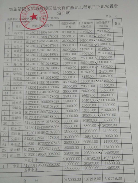 有资料显示:南沱镇连丰村5组,6组两个组其合计安置补助款总额是:945000元,扣除缴纳基本养老保险金款后,两个组合计返回安置补助款总额是:507718.00元。