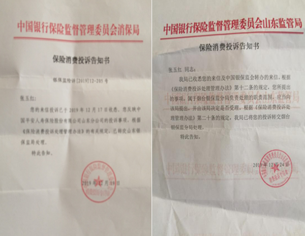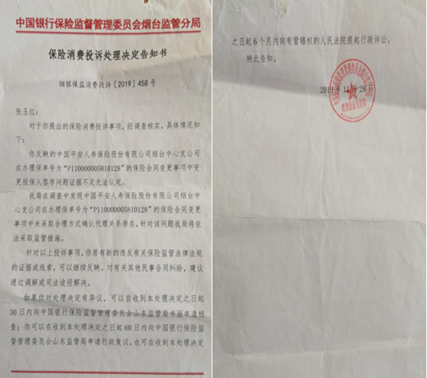 记者在张玉红提供的《中国银行保险监督管理委员会烟台监管分局保险消费投诉处理决定告知书》(烟银保监消费投诉(2019)458号)中看到,保险公司针对张玉红的投诉,答复称“证据不足无法认定”,同时还称:“在办理保单号为“11000005810128”的保险合同变更事项中,未采取合理方式确认代理关系存在,针对该问题我局将依法采取监管措施。”该告知书称: