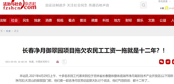 本站讯 2021年4月29日上午,十多名农民工代表来到位于吉林省长春窗体窗体底端市净月高新技术产业开发区(以下简称净月区)大顶山的御翠园门前,他们要一起去净月区劳动监察大队讨个说法,他们气愤的说:“都十二年了,因为大包赌博输掉了血本,吉润公司(全称:长春市建工新吉润公司)拖欠我们农民工的工资还没有结清,为了讨回自己的血汗钱,我们历尽艰难曲折,有的已经倾家荡产,还有的已经家破人亡了,可是他们就是不给,我们一定要讨个说法!”