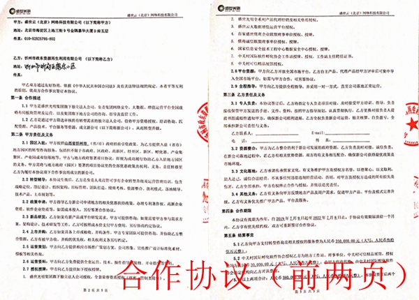 合作协议称:甲方是盛世光明集团旗下独立法入公司,负责集团网络安全、大数据、增值运营平台全国战略布局板块管理及运营,以及集团旗下地方公司的咨询、指导及监管工作。乙方是通过甲方筛选审核的有转型需求的独立法人公司,借势甲方资格授权、培训咨询、匹配资源、产品技术、平台服务等资源,成立新公司(以下简称新公司),从而转型升级。