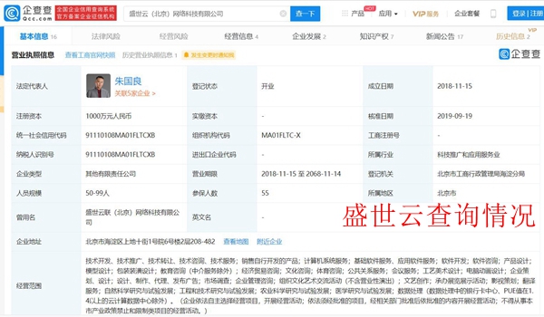 据百度查询,盛世云(北京)网络科技有限公司成立于2018年11月15日,注册地位于北京市海淀区上地十街1号院6号楼2层208-482,法定代表人为朱国良。其经营范围十分广阔,详见爱企查截图。