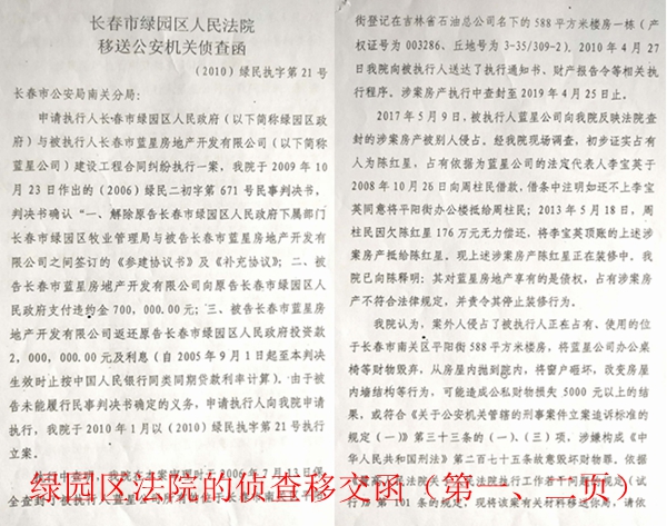 绿园区法院出具的《长春市绿园区人民法院移送公安机关侦查函》(【2010】绿民执字第21号)(以下简称侦查函)似乎印证了蓝星公司的说法。该侦查函称: