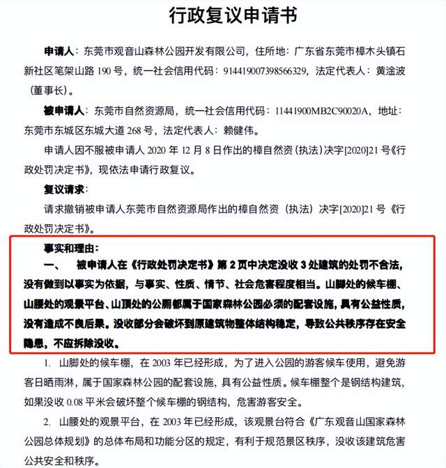 可是,观音山的据理力争异议书,却直接被东莞市自然资源局无视。无奈之下,公园方只能求援广东省自然资源厅,提出行政复议申请书,详细说明公园的实际情况,并汇报了东莞市自然资源局针对观音山的选择性报复处罚。