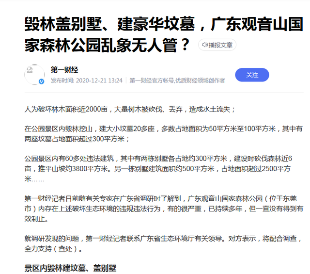 三、主流媒体第一财经了解观音山毁林违建情况后,于2020年12月21日发布了一篇《毁林盖别墅、建豪华坟墓,广东观音山国家森林公园乱想无人管?》报道,真实的揭露了东莞市自然资源局某些领导的不作为。该局某些领导恼羞成怒后又一次对观音山展开了更加疯狂的打击报复——强chai案。(升级)