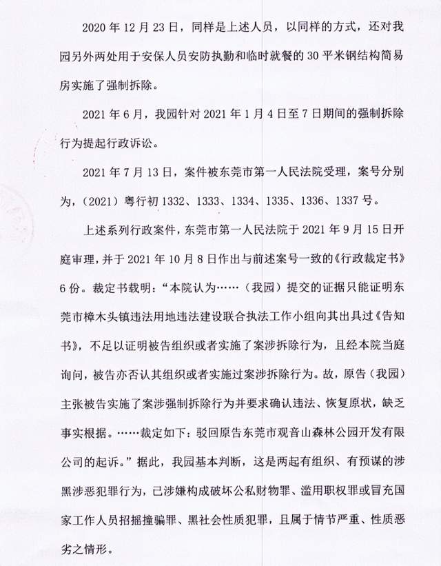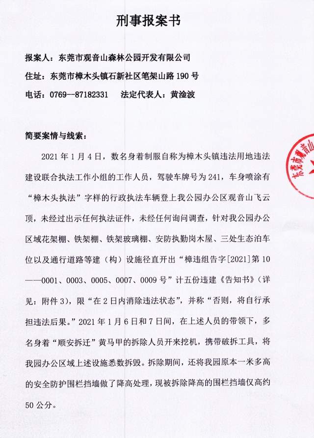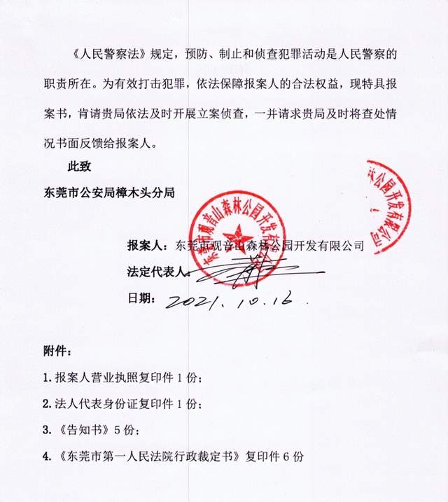 公园管理委员会介绍,2021年10月16日已经向樟木头公安分局邮寄了《刑事报案书》,向该局报送了刑事案件线索。报案书中指控涉及的刑事犯罪罪名具体有,“有组织、有预谋的涉hei涉e犯罪、破坏公私财产罪、滥用职权罪或者冒充国家工作人员招摇撞骗罪、黑sh性质犯罪”,要求樟木头分局依法履行警察职责,开展立案调查处理,并要求将立案查处情况书面反馈报案人。不过,最后也是不了了之……