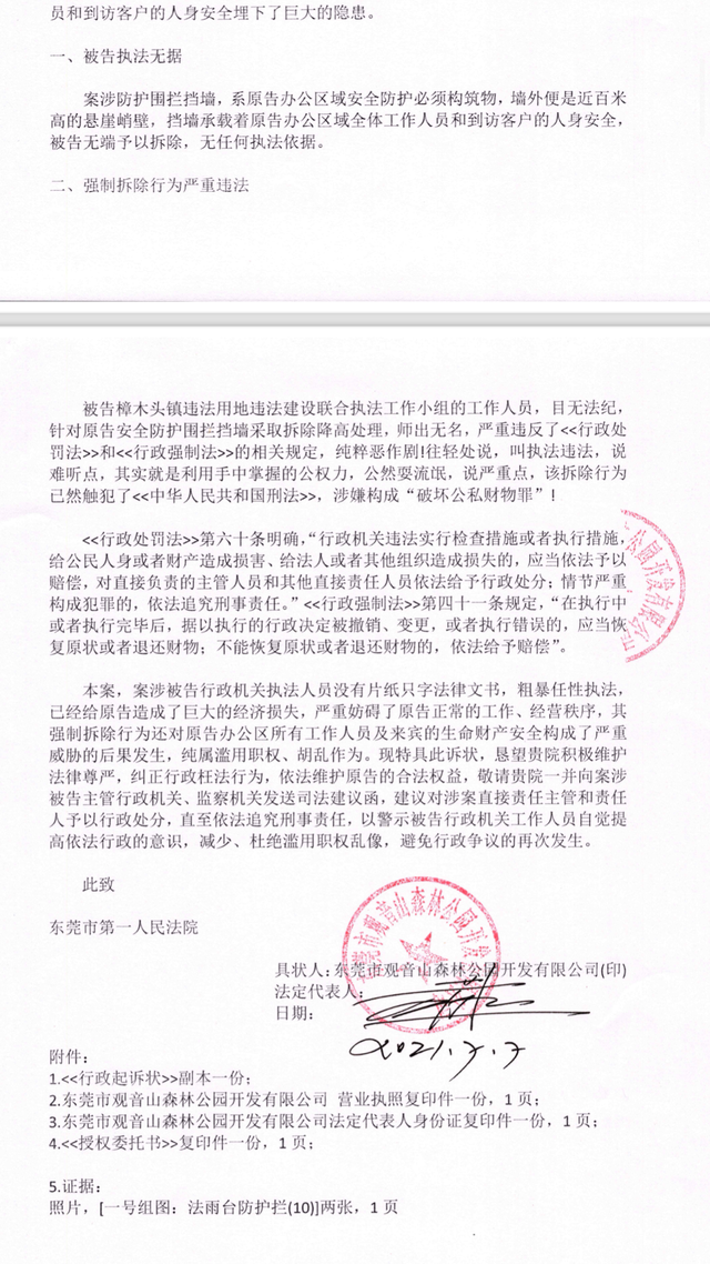 基于上述辩论意见,公园方在法庭辩论环节还专门向法庭提交了书面的《法庭辩论意见书》。意见书强调了两点:一是,被告樟木头镇政府“两违小组”实施行政处罚强制行为执法程序严重违法;二是,被告“两违小组”执法超越法定职权违法。