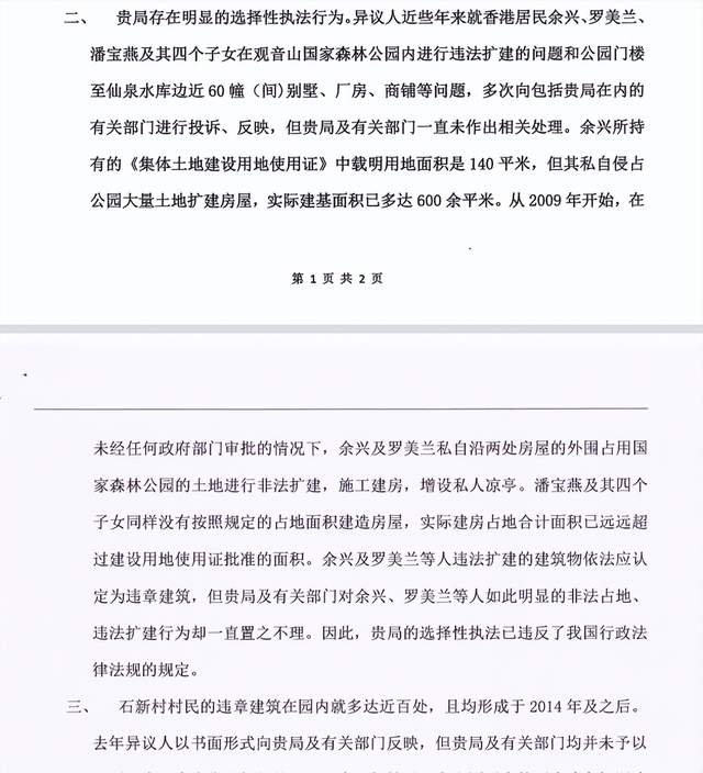 (2)就观音山公园内多幢违建别墅问题和公园门楼至仙泉水库附近70余幢(间别墅、厂房、会所、商铺)等问题,多次向贵局投诉,但贵局一直未作出认真的处理。贵局的选择性执法行为已违反了我国行政法律法规的规定。