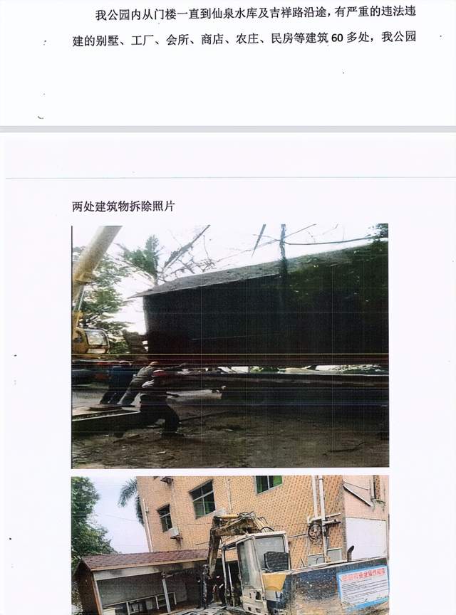 “东莞市自然资源局、樟木头镇两违小组,对我公园的旅游基础服务设施针对性进行拆除,精确到分毫。却对我公园内从门楼一直到仙泉水库及吉祥路沿途,有严重的违法违建的别墅、工厂、会所、商铺、农家乐等70余处不予以拆除,完全是选择性执法报复,严重违反了行政法律法规,属于滥用职权。”公园相关负责人说。