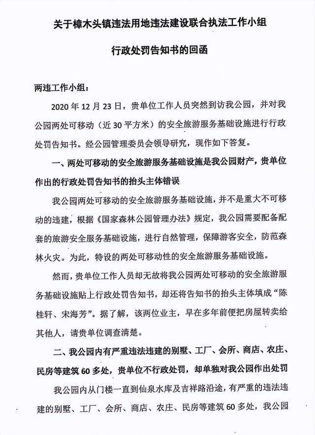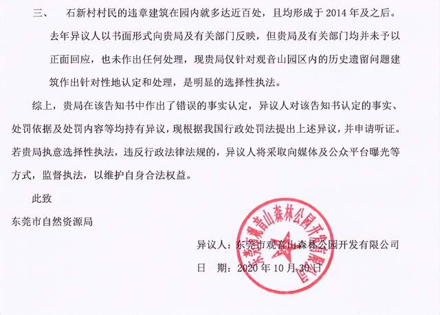 对于这一处罚决定,观音山公园方于2020年10月30日正式回函据理力争,提出如下几方面异议:
