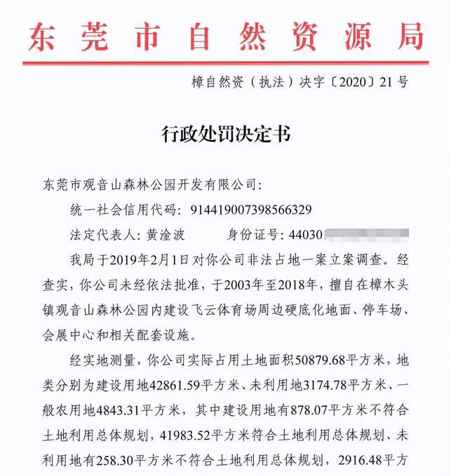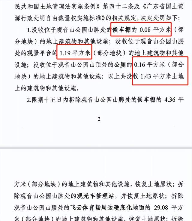 该处罚决定书显示:根据《中华人民共和国土地管理法》第七十七条、《中华人民共和国土地管理法实施条例》第四十二条及《广东省国土资源行政处罚自由裁量权实施标准》的相关规定,决定处罚如下:1.没收位于观音山森林公园山脚处的候车棚的0.08平方米(部分地块)的地上建筑物和其他设施;没收位于观音山森林公园山腰处的观景平台的1.19平方米(部分地块)的地上建筑物和其他设施;没收位于观音山森林公园山顶处的公厕0.16平方米(部分地块)的地上建筑物和其他设施;以上共没收1.43平方米土地上建筑物和其他设施……