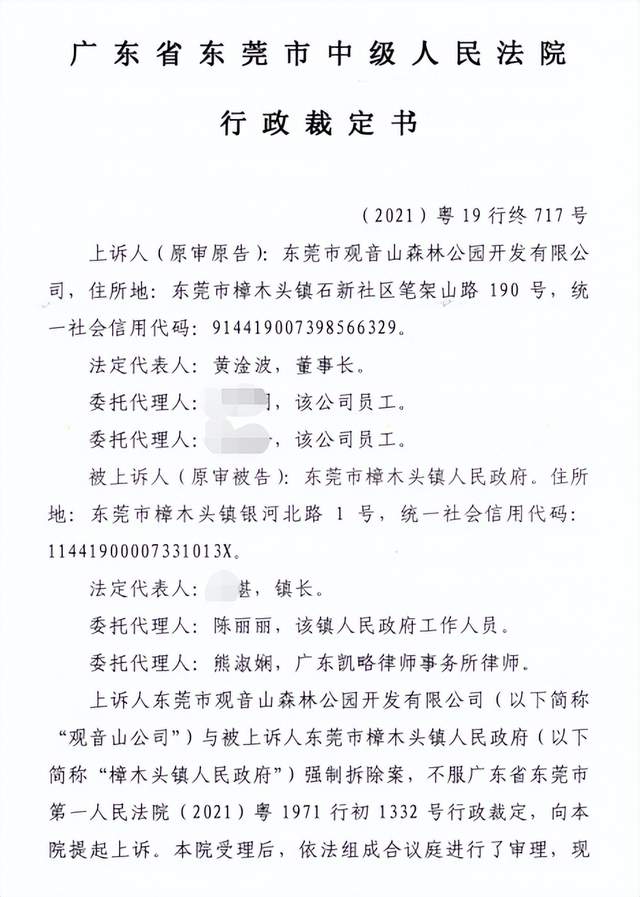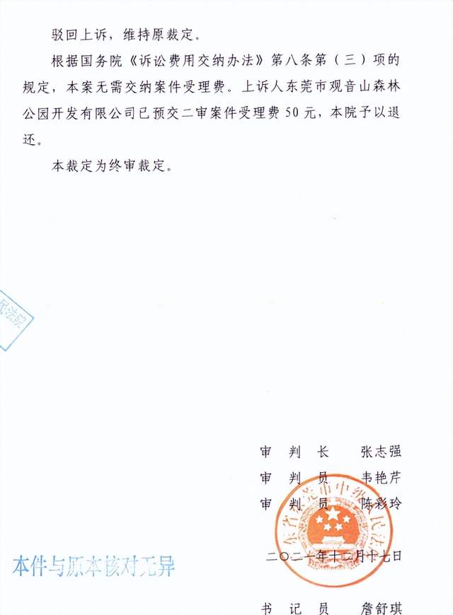 公园方不服一审裁定,向东莞中院提起上诉。2021年12月17日,公园收到东莞中院作出的二审裁定书:“驳回起诉,维持原裁定”。