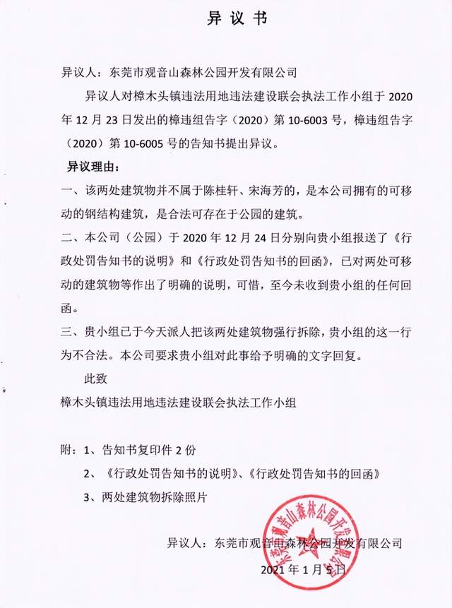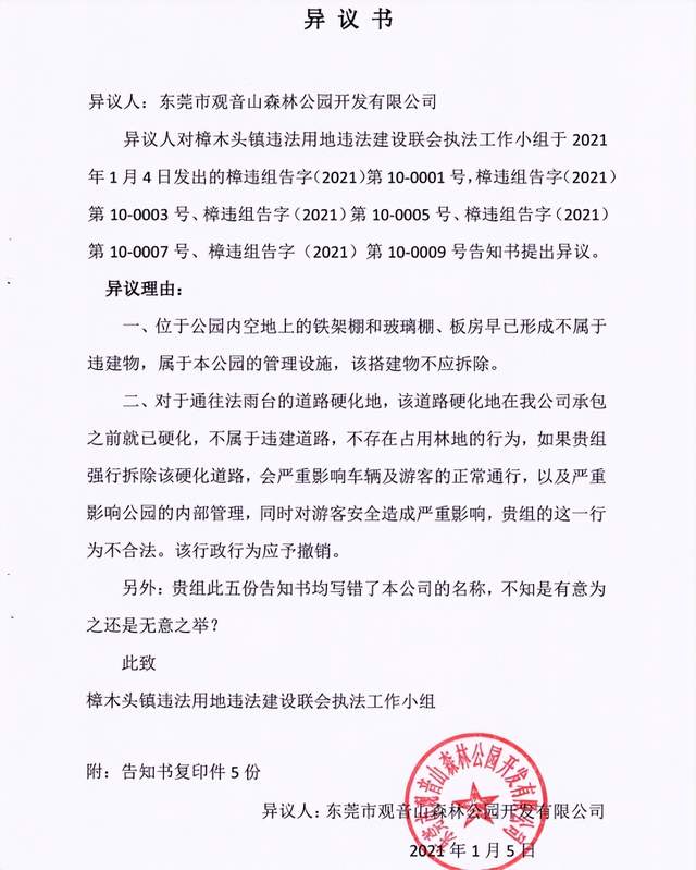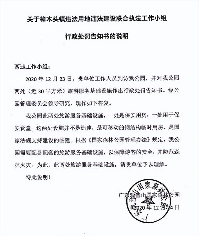 2020年12月23日,在东莞市自然资源局的主导批示下,樟木头镇两违小组突然驾驶车辆驶入观音山,在未经过出示任何执法证件,未经任何询问调查,就对我公园的管理设施凤凰台两处可移动的钢结构临时基础设施作出行政处罚告知书(一处是保安用房;一处用于保安食堂;合计近30 ㎡)。我公园积极致电到樟木头镇两违小组进行交涉,并回函说明这两处设施并不是违建,是可以移动的钢结构临时用房,是国家法规允许建设的临建。根据《国家森林公园管理办法》规定,是我公园需要配备配套的旅游服务基础设施,以保障游客的安全并防范森林火灾。