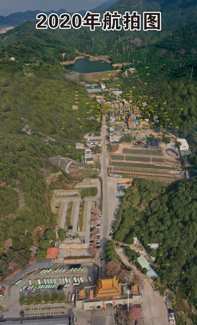 配图:此为公园门楼至仙泉水库之间的全景图,图中违建均有编号,如与2003年的卫星图相比较则可分辨出违建的位置和数量。