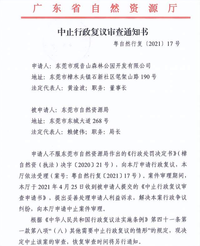 守得云开见月明,经过观音山的据理力争与不懈努力,以及广东省自然资源厅了解实际情况后的公平、认真对待,针对观音山55万的行政处罚案终于被省厅受理并及时中止。