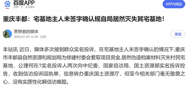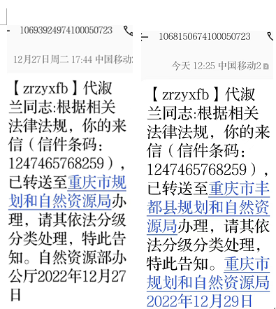 上图根据实名信访国土资源部2022年12月27日转送至重庆市规划和自然资源局在202212月29日又转送至重庆市丰都县规划和自然资源局信息回复。