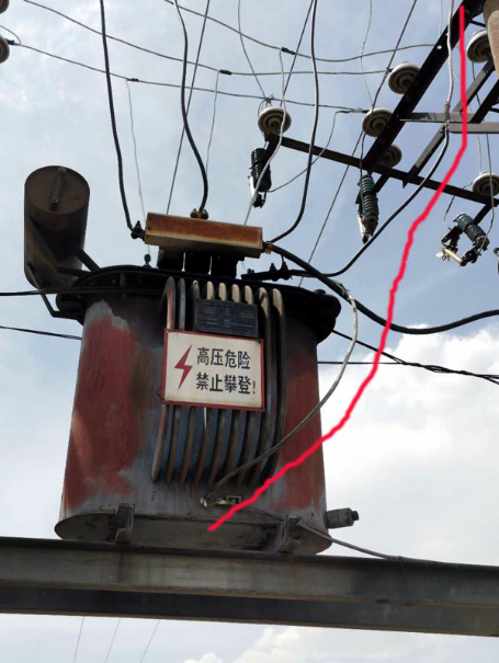 九泉村变台、部分线杆未改造,个别线杆倾斜严重,电线搭接在村民房顶上,套管已经磨损电线外露。