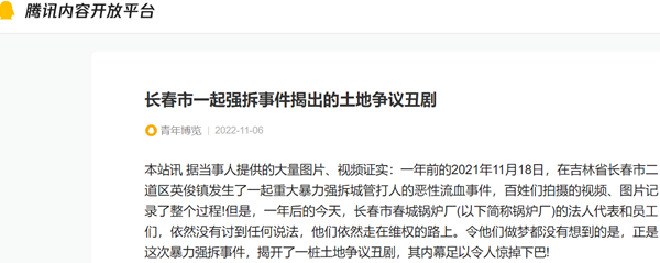 本站讯 据当事人提供的大量图片、视频证实:一年前的2021年11月18日,在吉林省长春市二道区英俊镇发生了一起重大暴力强拆城管打人的恶性流血事件,百姓们拍摄的视频、图片记录了整个过程!但是,一年后的今天,长春市春城锅炉厂(以下简称锅炉厂)的法人代表和员工们,依然没有讨到任何说法,他们依然走在维权的路上。令他们做梦都没有想到的是,正是这次暴力强拆事件,揭开了一桩土地争议丑剧,其内幕足以令人惊掉下巴!
