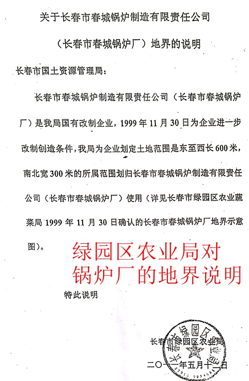 记者从汲长奎提供的材料中,看到长春市绿园区农业局加盖公章的《关于长春市春城锅炉制造有限责任公司(长春市春城锅炉厂)地界的说明》,该《说明》证实:“长春市春城锅炉制造有限责任公司(长春市春城锅炉厂)是我局国有改制企业,1999年11月30日为企业进一步改制创造条件,我局为企业划定土地范围是东至西长600米,南北宽300米的所属范围划归长春市春城锅炉制造有限责任公司(长春市春城锅炉厂)使用(详见长春市绿园区农业蔬菜局1999年11月30日确认的长春市春城锅炉厂地界示意图)。”