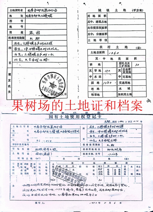 2002年12月19日,长春经济技术开发区国土局从经开区把手伸到二道区,跨区、越权,把不在其属地管辖区的果树场及锅炉厂土地登记在“长春经开区土地收储中心”名下,发放长经开国用【2002】0000165号114公顷土地证,面积超过果树场原土地证面积(103公顷)10多公顷。就这样一分钱没花,从法律上霸占了绿园区果树场和春城锅炉厂103公顷土地,经开区国土局没有通知当事人,随便就把别人的土地以“法律的名义”轻而易举占有了,其跨区、越权办理土地证,是严重的侵权、违法行为,为日后发生的一切埋下了祸根!