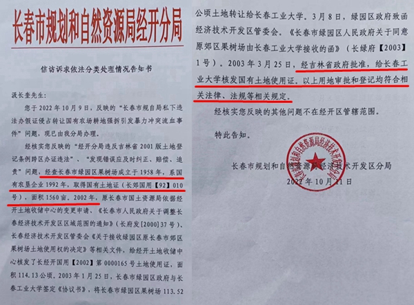 在锅炉厂一方多次上访后,长春市规划和自然资源局经开分局做出一份《信访诉求依法分类处理情况告知书》,该《告知书》虽然称:“长春市绿园区果树场成立于1958年,系国有农垦企业,1992年取得长郊国用【92】010号土地证,面积1560亩(103公顷)。”但又称:“2002年,原长春市国土局依据经开土地收储中心的变更申请、《长春市人民政府关于调整长春经济技术开发区区域范围的通知》长府发【2000】37号、长春经济技术开发区管委会《关于接收绿园区原长春市郊区果树场土地使用权的决定》等相关文件,给经开土地收储中心核发了长经开国用【2002】第0000165号土地使用证,面积114.13公顷。”其又称:“2003年1月25日,长春市绿园区政府与长春工业大学签订《协议书》,将长春市绿园区果树场113.52公顷土地转让给长春工业大学。3月8日,绿园区政府致函经济技术开发区管委会《长春市绿园区人民政府关于同意原郊区果树场由长春工业大学接收的函》(长绿府[2003]1号)。2003年3月25日,经吉林省政府批准,给长春工业大学核发国有土地使用证。” 《告知书》最后坚称:“以上用地审批和登记均符合相关法律、法规等相关规定。”