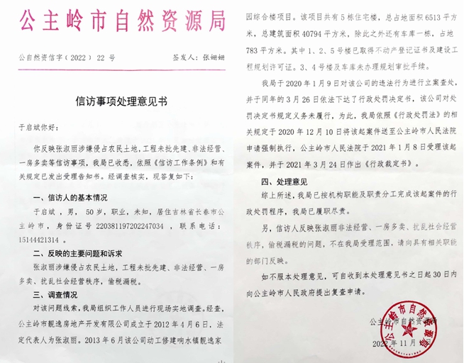 2,《信访事项处理意见书》(公主岭市自然资源局公自然资信字(2022)22号)证明张淑丽开发的靓逸家园3、4号楼及车库未办理规划审批手续。该意见书称:经查,靓逸公司成立于2012年4月6日,法定代表人为张淑丽。2013年6月该公司动工修建响水镇靓逸家园综合楼项目。该项目共有5栋住宅楼,总占地面积6513平方米,总建筑面积40794平方米,除此之外还有车库一栋,占地783平方米。其中1.2、5号楼已取得不动产登记证书及建设工程规划许可证。3、4号楼及车库未办理规划审批手续。我局于2020年1月9日对该公司的违法行为进行立案查处,并于同年的3月26日依法下达了行政处罚决定书,该公司对处罚决定书规定义务未履行,为此,我局依照《行政处罚法》的相关规定于2020年12月10日将该起案件送至公主岭市人民法院申请强制执行,公主岭市人民法院于2021年1月8日受理该起案件,并于2021年3月24日作出《行政裁定书》。