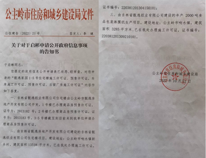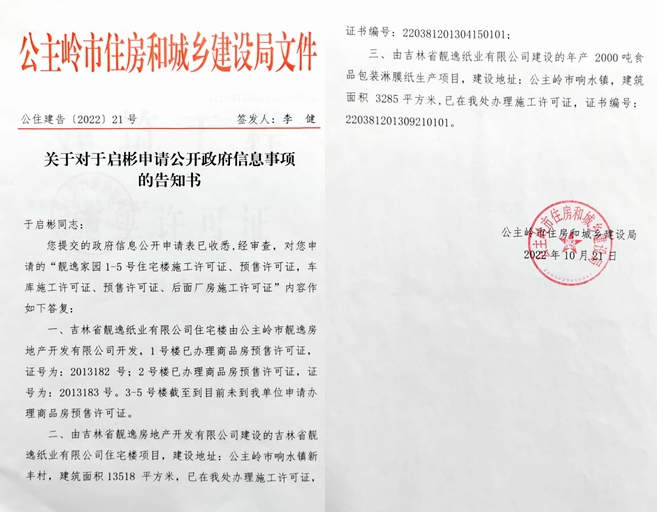 3,公主岭市住房和城乡建设局文件(公住建告(2022)21号)证明靓逸家园3-5号楼未办理商品房预售许可证。该文件称:吉林省靓逸纸业有限公司住宅楼由靓逸公司开发,1号楼已办理商品房预售许可证,证号为:2013182号;2号楼已办理商品房预售许可证,证号为:2013183号。3-5号楼截至到目前未到我单位申请办理商品房预售许可证。