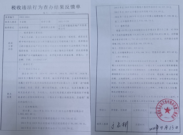 3,国家税务总局长春市税务局第三稽查局的《税收违法行为查办结果反馈单》(编号:2201062020000001)对吉林省靓逸纸业有限公司认定:该企业2013年、2014年,2015年,2016年,2017年,2018年、2019年少缴纳营业税,增值税,城市维护建设税、企业所得税的行为属于《中华人民共和国税收征收管理法》第六十三条第一款“纳税人伪造、变造、隐匿、擅自销毁账薄、记账凭证,或者在账簿上多列支出或者不列、少列收入,或者经税务机关通知申报而拒不申报结果或者进行虚假的纳税中报,不缴或者少缴应纳税款的,是偷税“规定的偷税行为”。“综上,应补缴税费合计2,970,508.70元,罚款合计681,455.62元。”