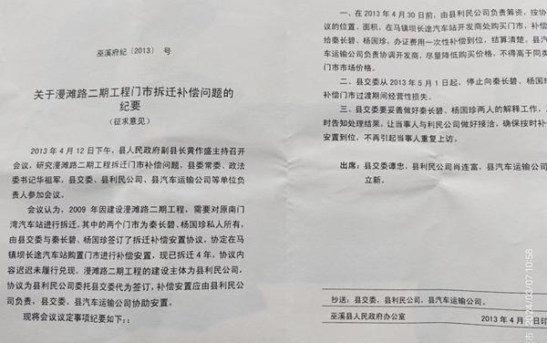 2013年4月,巫溪县政府作出“巫溪府纪{2013}号”会议纪要(征求意见),会议认为,2009年因建设漫滩路二期工程,需要对原南门湾汽车站进行拆迁,其中的两个门市为秦长碧、杨国珍所有,由县交委与秦长碧、杨国珍签订了拆迁补偿安置协议,协定在新建的长途汽车站购置门市进行补偿安置,现已拆迁四年,协议内容迟迟未履行兑现。漫滩路二期工程的建设主体为县利民公司,协议为县利民公司委托县交委签订,补偿安置应由县利民公司负责,县交委、县汽车运输公司协助安置。最终,利民公司还是没有对两拆迁户进行补偿安置,2013年5月起,对两拆迁户停止发放门市过渡期间经营性损失。