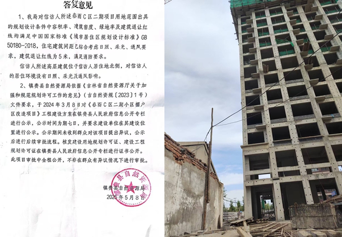 面对争议,镇赉县相关部门作出了回应。镇赉县自然资源局于 2025年5月12日发布情况说明,称信访人所居住房屋不在春雨 C 区二期项目用地范围内,项目的容积率、建筑密度等规划设计条件满足国家标准,住宅建筑间距已综合考虑日照、采光、通风要求,不存在对信访人居住环境的影响,且项目审批前已征询各单位意见、进行公示,公示期间未收到群众异议,后续审批流程规范,全程公开,不存在群众有异议情况下进行审批的情况 。